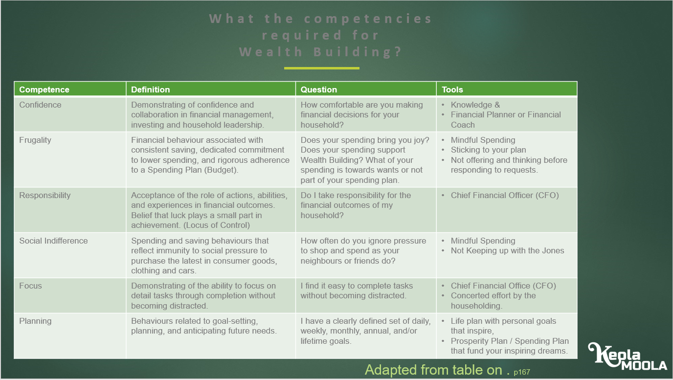- Their research indicated that there are six key competencies that are critical to support building wealth.